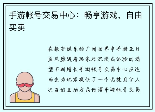 手游帐号交易中心为玩家创造了一个全新的游戏天地,让他们可以畅享游戏,自由买卖,并提升他们的整体游戏体验。